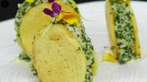 With shallot-wasabi sauce, served with burrata Caprese salad and pesto.